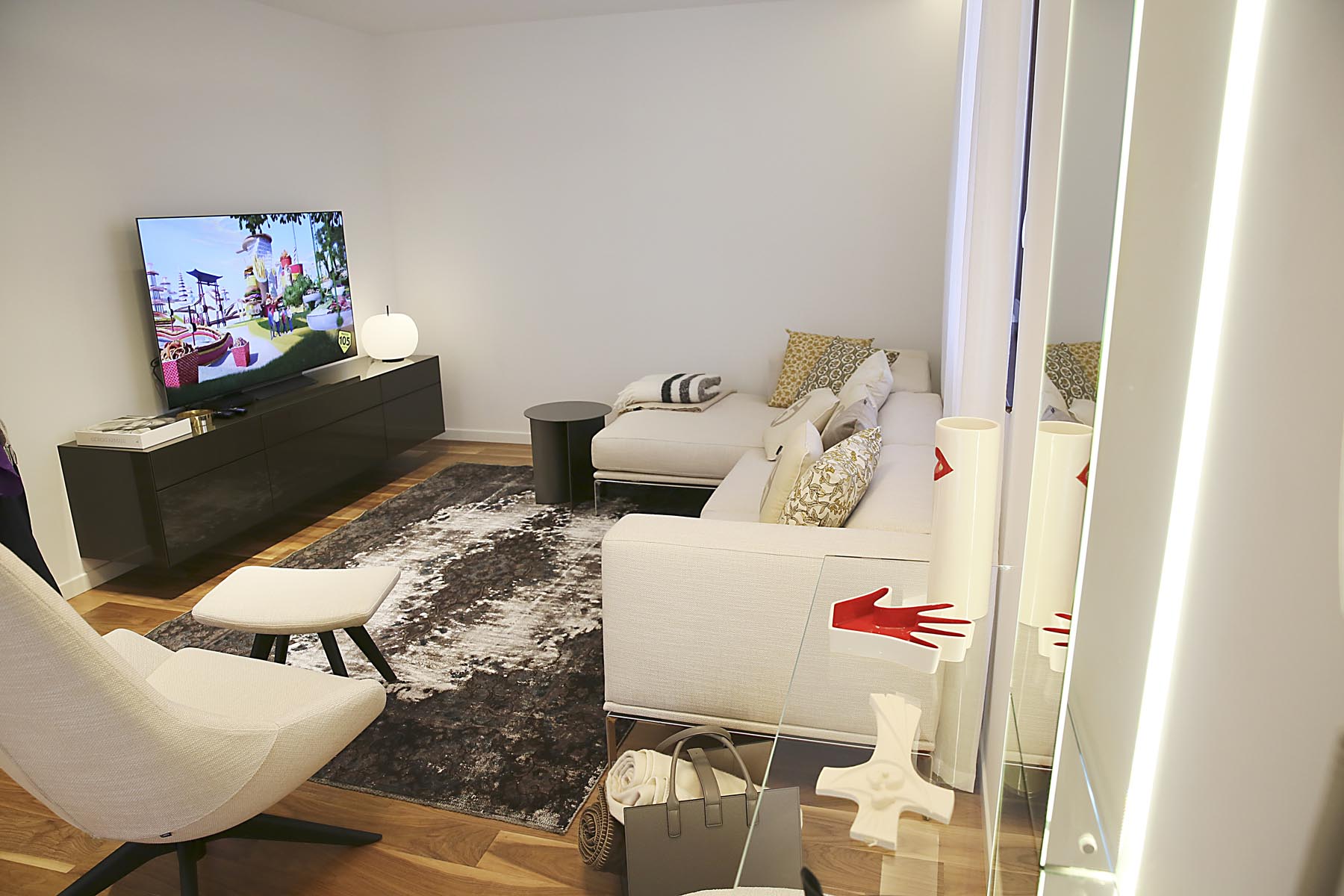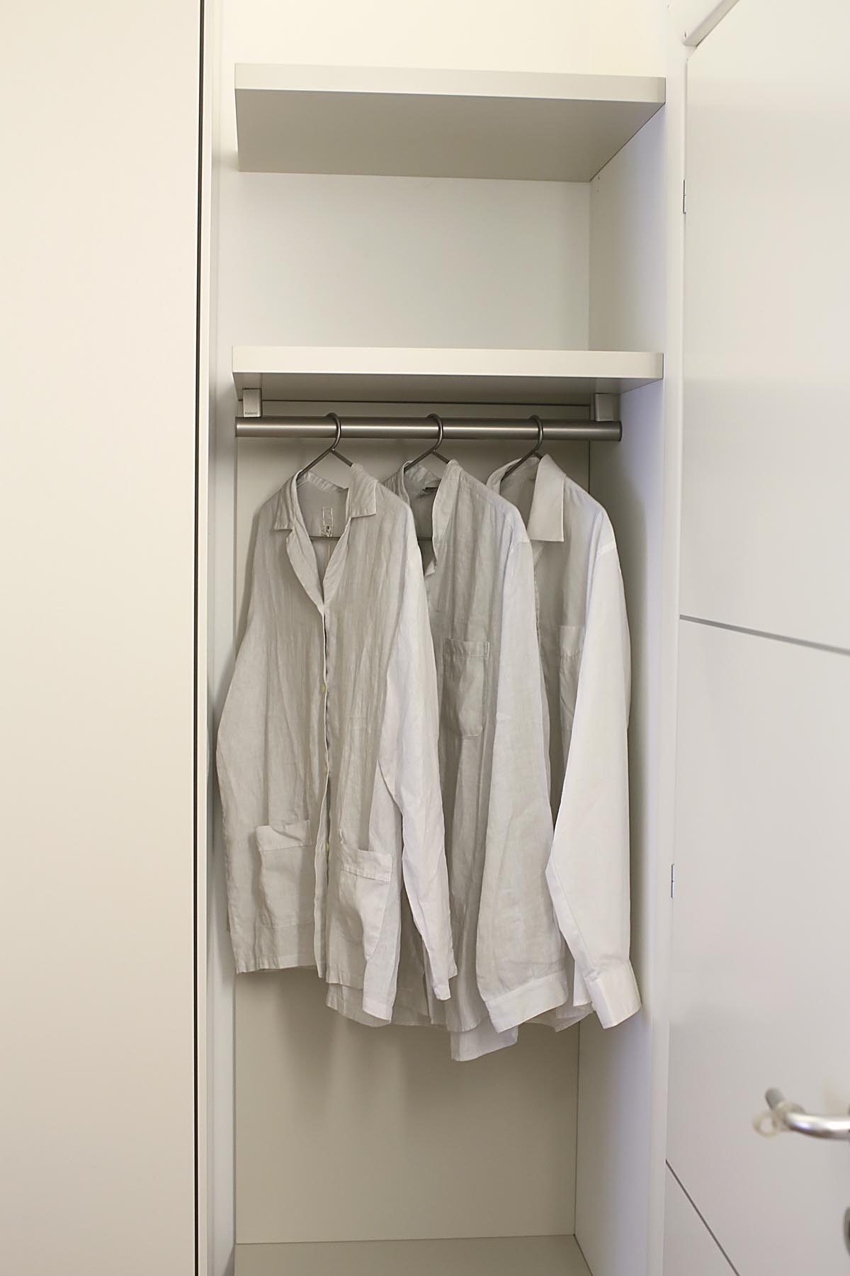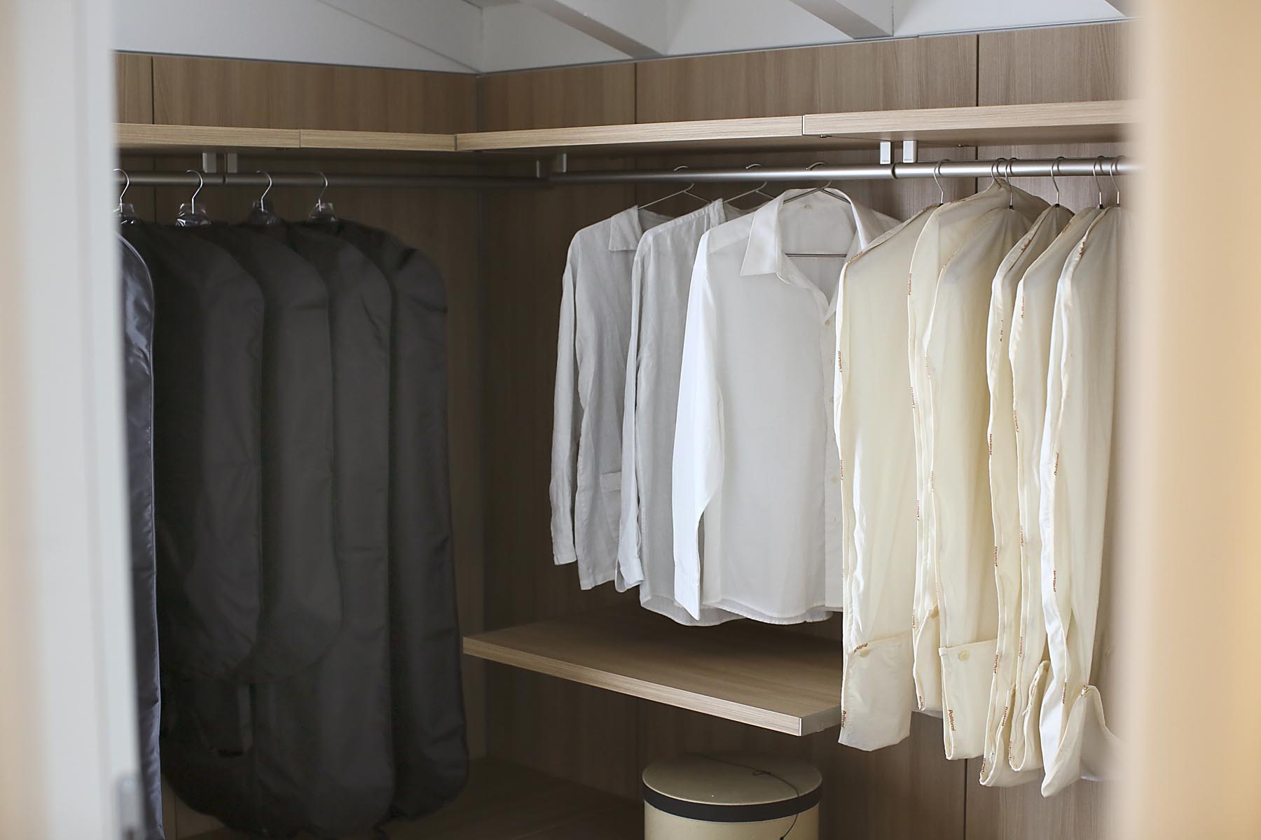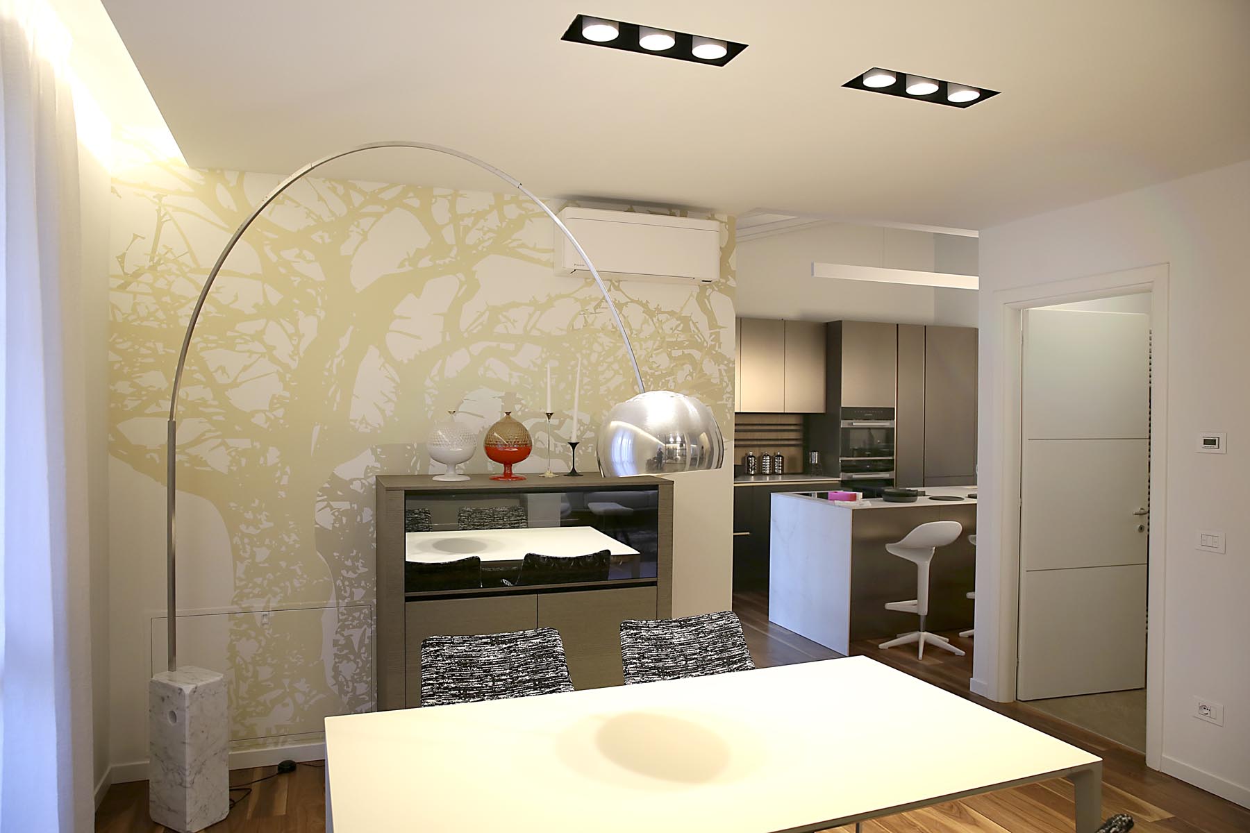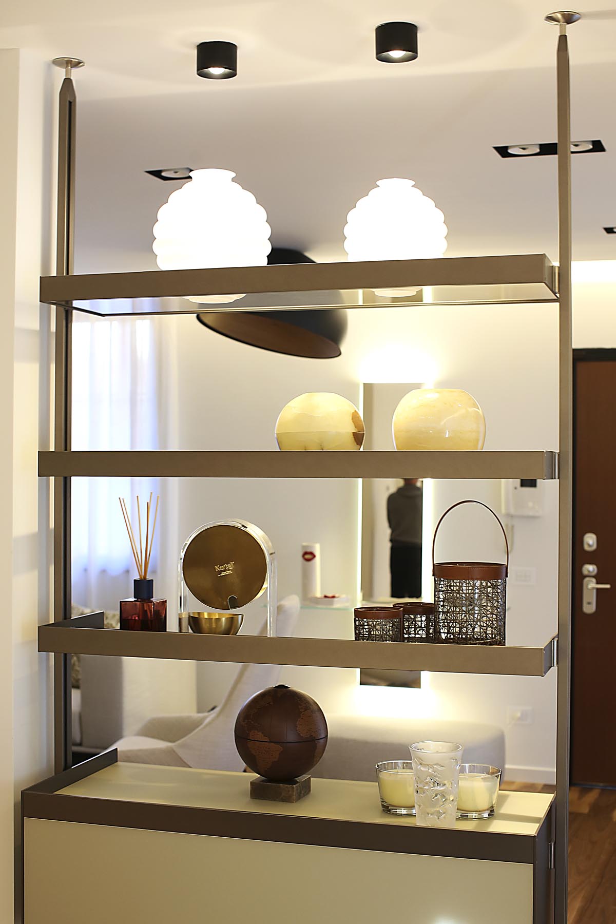 Tutto questo, insieme alla scelta delle tende, ha reso possibile ottenere un involucro luminoso e neutro, all’interno del quale siamo riusciti ad inserire un arredo semplice e funzionale, ma di grande carattere e con finiture molto eleganti come la cucina realizzata con particolari color champagne, la zona living in alluminio e vetro laccato e la zona notte, mansardata, dove un locale è stato dedicato ad una cabina armadio realizzata in legno di olmo con ferramenta Champagne.